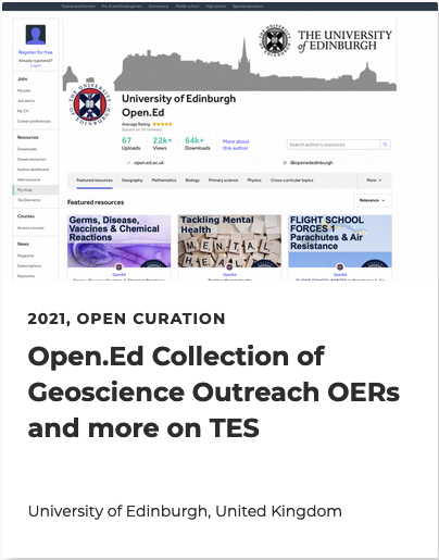 Since 2015, the University of Edinburgh’s Open Education Resource (OER) Service has collaborated with Geoscience’s Outreach (GO) course, where students create educational projects with community clients, to curate an exceptional collection of high quality OERs into an accessible collection on the TES platform. This curated collection now consists of 59 OERs, packaged for teacher’s ease, on wide ranging scientific topics for ages 3-18. Covid-19 lockdowns and home-schooling illustrated the importance of the broad reach of this collection with downloads increasing 60% in 2020.