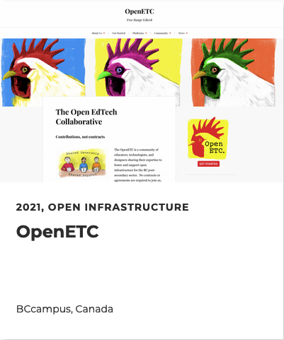 As a model, the OpenETC provides an alternative to a vendor or shared service model, and by providing open ed tech tools to the public higher education sector supports a shift to more critical reflection of proprietary software and data and privacy protection. Although OpenETC was established in 2017, BCcampus has more recently become an important financial supporter of OpenETC by providing funding for a 3 year pilot. This support also signals a recognition of the importance of open ed tech tools as part of the broader open education movement.