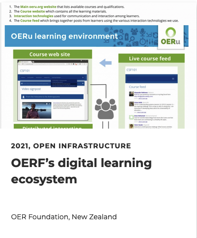 Over the last ten years, adhering to their “open” principles, the OER Foundation has established a fully functioning digital learning ecosystem for collaborative development and delivery of OER enabled micro-courses based entirely on Free and Open Source Software (FOSS). This is a loosely coupled, component-based system assembled from “best of breed” FOSS applications that can operate at internet scale, plus software code components developed by the Foundation to “glue” the system together and provide enhanced functionally. The OERF’s digital learning ecosystem is worthy of nomination because it is: 1) eminently scalable – during 2020 the OERu provided access to more than 200,000 learners using the platform; 2) cost effective – the entire server infrastructure is provided for less than USD8500 per annum in software and infrastructure costs; 3) innovative – learners learn to learn on the internet, rather than in a single application like a learning management system; 4) suitable for developing country contexts – institutions in the developing world with constrained budgets for technology can replicate the systems using technical recipes published by the Foundation or join the OERu Outreach Partnership Programme for free to build capacity to host these tools themselves; 5) designed for collaboration and OER remix as evidenced by reuse and remix scenarios around the world.