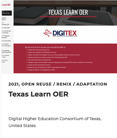Texas Learn OER is a set of openly licensed, self-paced modules for faculty, staff, and administrators adapted from ACC Learn OER by Carrie Gits at Austin Community College for the Digital Higher Education Consortium of Texas (DigiTex). (Gits created ACC Learn OER in 2018 for her capstone project for the SPARC Open Education Leadership Program.) Released in August 2020, Texas Learn OER serves primarily as an introduction to OER, including such topics as understanding, licensing, finding and evaluating, and adapting and sharing OER, and there is an opportunity to earn a certificate of completion. The modules have been peer-reviewed by both state and national OER experts and are regularly updated, and continuous improvement plans include annual releases of more significant revisions to ensure the content is relevant and up-to-date.