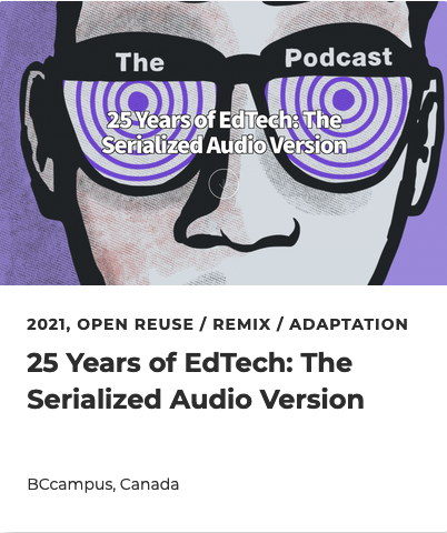 “25 Years of EdTech: The Serialized Audio Version” is an adaptation of Martin Weller’s “25 Years of EdTech” book into a community audiobook, published in podcast form. Each chapter of the book has been read by a different member of the open education community and was released on a weekly schedule between November 2020 and May 2021. The original 25 Years of EdTech is published by AUPress under an open license.