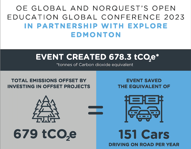 The Open Education Global 2023 conference is a carbon-neutral event. When planning our event, we made conscious choices to keep our emissions low. Open Education Global and Norquest College worked with Explore Edmonton and Ostrom Climate Solutions, Canada’s leading carbon management solutions provider, to measure our event’s total greenhouse gas emissions.