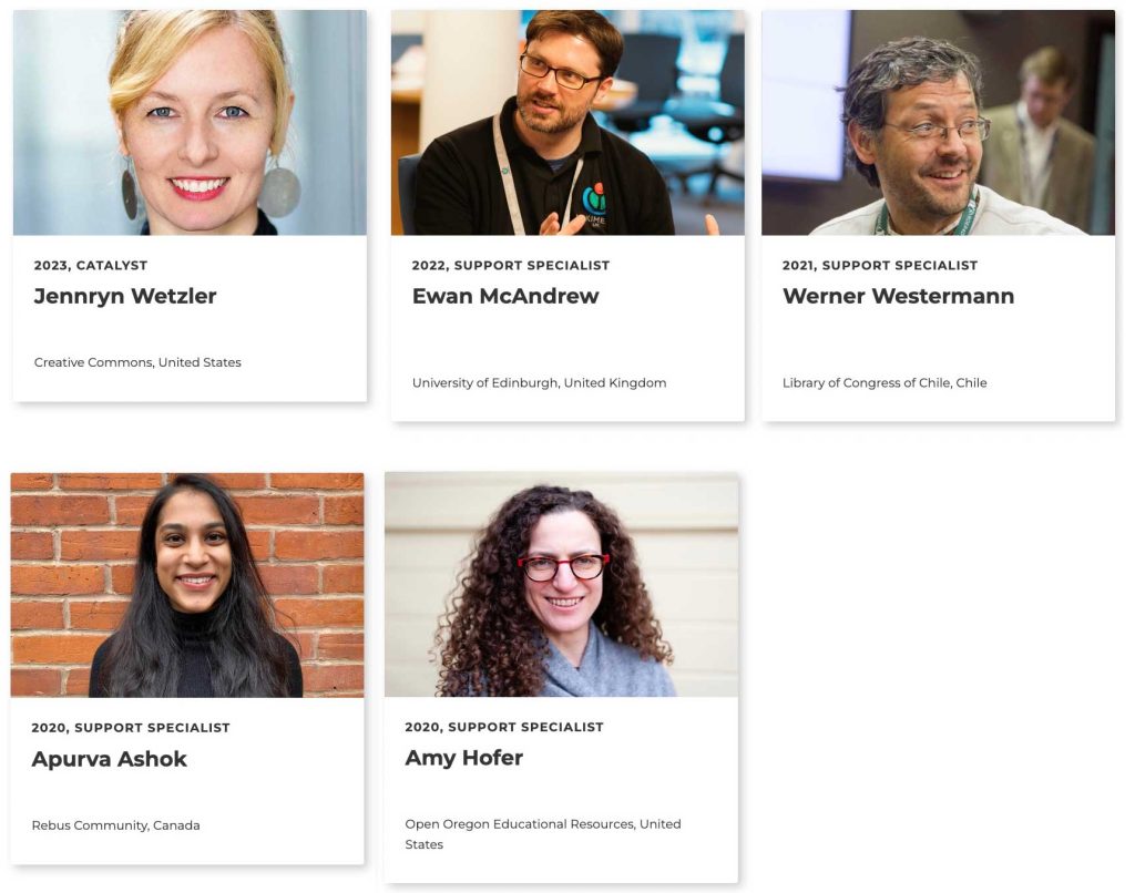 At the same time, “support specialists” seemed like an underestimate of the role these individuals play in their organization and the larger open education community. Therefore, last year, we renamed this award the Catalyst Award, well exemplified by the 2023 awardee, Jennryn Wetzler of Creative Commons. As we heard in our recent podcast conversation with Jennryn, drawing from a Chemistry metaphor, this award describes someone who “helps other reactions happen without being consumed itself.”