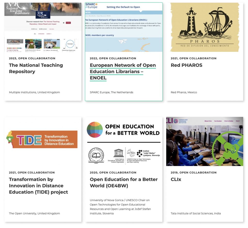 The awards to the Transformation by Innovation in Distance Education (TIDE) project (2021), Red PHAROS (2021), and European Network of Open Education Librarians—ENOEL (2022) highlight large-scale collaboration in Myanmar, Mexico, and across Europe. Last year’s Open Collaboration Award went to The National Teaching Repository, a community-driven resource that provides direct evidence of impact. While based in the UK, the open repository supports educators anywhere.