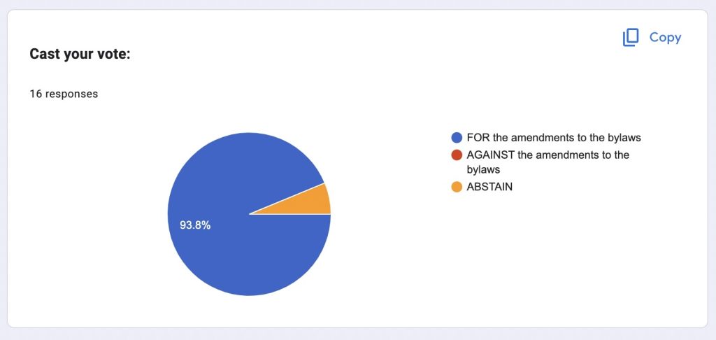 The Board of Directors, led by Perrine de Coëtlogon, Board President, introduced the main points of the proposed amendments. The meeting was held online, and online asynchronous voting by proxy was permitted. Members voted during the General Assembly and adopted the amended Bylaws, with 93.8% of eligible members voting for the proposed amendments.