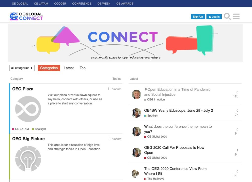 You can read about the current discussion areas available in OEGlobal Connect. But maybe the best way to understand OEGlobal Connect is to visit and look around. Most topics are open to anyone to read, so why not look now? Join a conversation or start a new topic, go to connect.oeglobal.org.